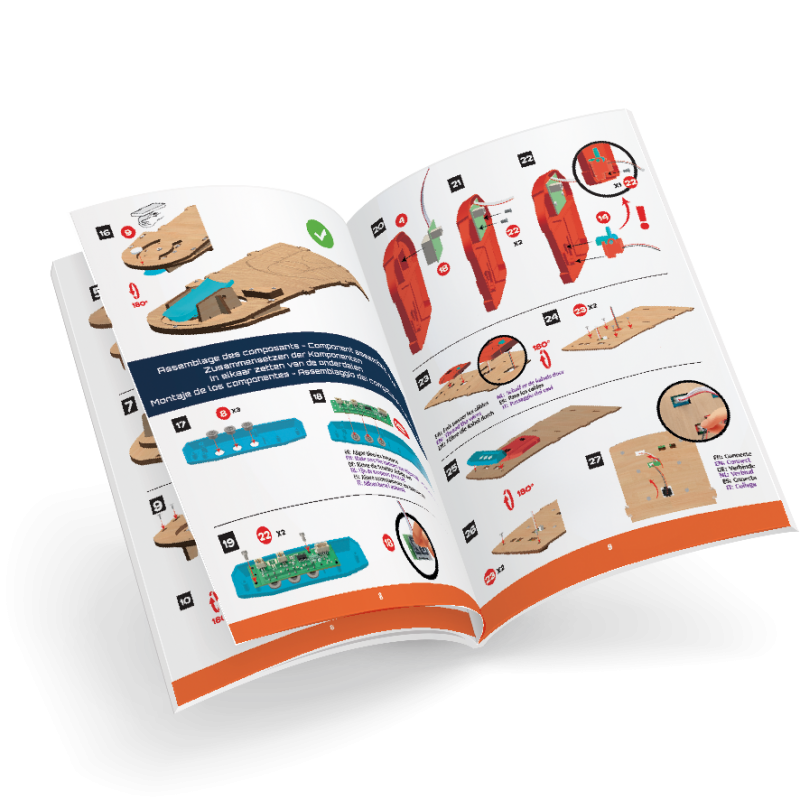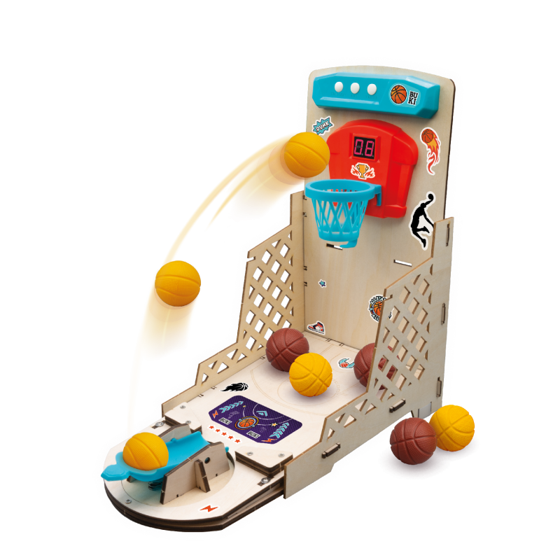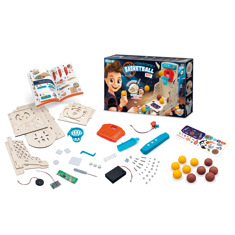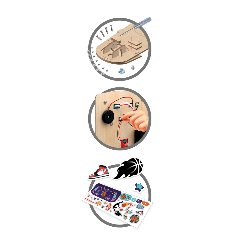 A kit to build your own electronic basketball hoop. Using the included screwdriver, children can safely assemble the scoreboard, control panel, speaker, and battery compartment – no soldering required. Customise the hoop with the included stickers.