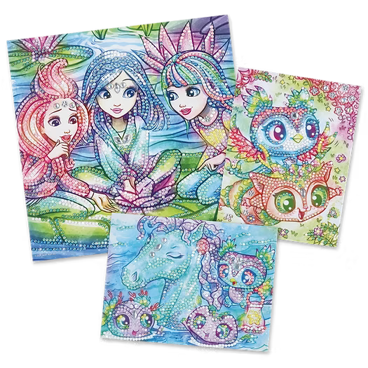 Create 3 bedazzled masterpieces! Use a special applicator to apply micro-gems to adhesive templates. Follow the numbers associated with each color. The final result is amazing!!