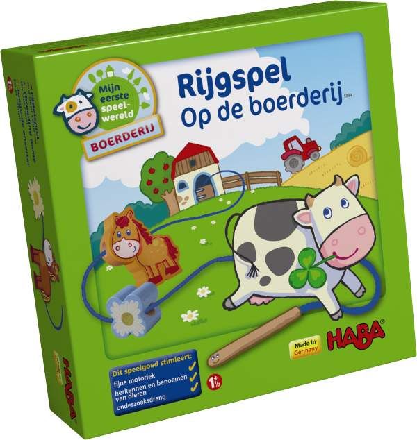 Inhoud: 2 rijgsnoeren met stal, 1 koe, 1 kalf, 1 paard, 1 veulen, 1 klaverblad, 1 bloem, 1 melkbus, 1 hoefijzer, 4 opgavenkaarten, 1 zakje.